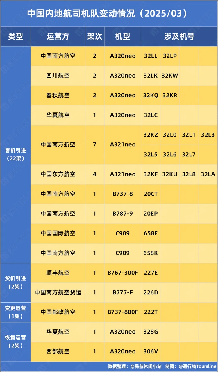 2025年3月,中国内地航司合计引进22架客机和2架全货机,其中空客A320neo系列18架,占比超八成,此外还引进了2架国产C909、1架787-9宽体客机和1架737-8。航司方面,中国南方航空本月引进12架,这个数量也刷新了月度飞机引进新记录。