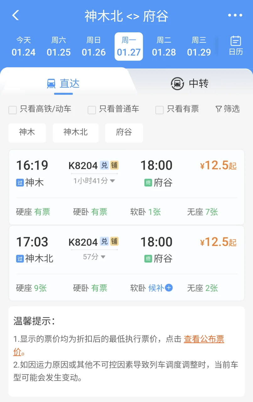 最近通通发现,K8203/4次列车所停靠的府谷和神木北两站,已登陆12306实现了联网售票。由府谷或神木北出发的旅客,可以直接在12306购买车票,无需前往车站排队取号;反之前往府谷或神木北两站的旅客,也无需另外补票,亦可直接在12306网站购买。